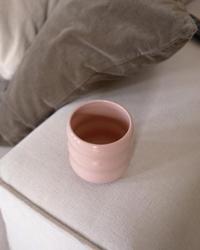 Gefertigt aus cremefarbenem Steinzeugton und liebevoll an der Töpferscheibe geformt, überzeugt er nicht nur mit seiner natürlichen Optik, sondern auch mit den feinen, von Hand gezogenen Wellen, die angenehm in der Hand liegen.